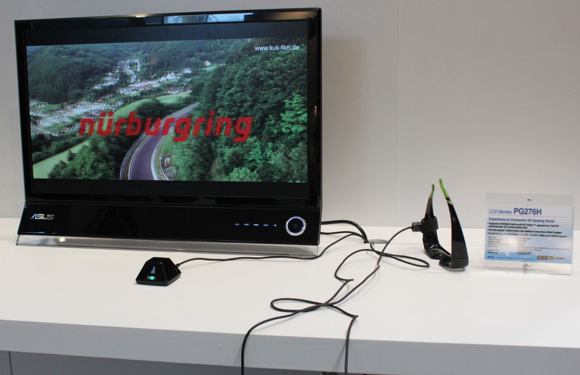 Asus is showcasing one 23-inch and one 27-inch LCD 3D monitor and both will be available in Q2. The first one is designated PH276H and it has native resolution of 1920x1080 pixels, 2ms response time, two dual-link DVI and one HDMI input with full HD 1080 support. The price is not clear at the moment, but it should be $200-$300 more expensive than comparable 27-inch non-3D monitor.