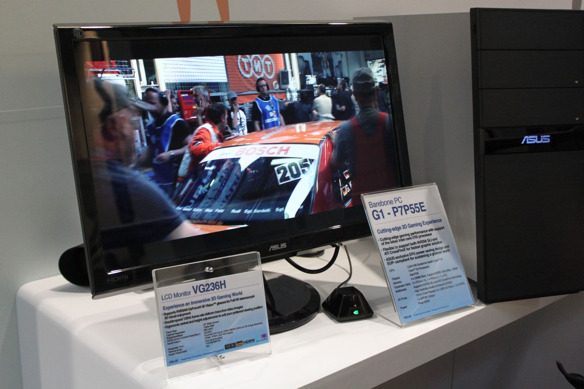 Asus is showcasing one 23-inch and one 27-inch LCD 3D monitor and both will be available in Q2. The first one is designated PH276H and it has native resolution of 1920x1080 pixels, 2ms response time, two dual-link DVI and one HDMI input with full HD 1080 support. The price is not clear at the moment, but it should be $200-$300 more expensive than comparable 27-inch non-3D monitor.