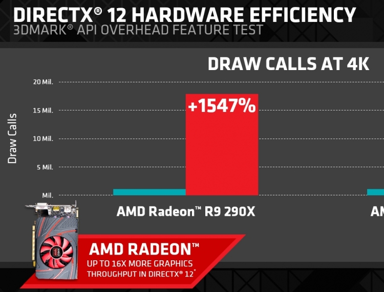 The new API Overhead benchmark update for 3DMark actually compares draw calls on different APIs, comparing DirectX 11, DirectX 12 and Mantle APIs on a single system. AMD followed Futuremark's notes saying that the API Overhead benchmark should not be used to compare GPUs from different vendors and has only showed the draw call throughput between DirectX 11 and DirectX 12 on Radeon R9 290X and the R7 260X graphics cards.