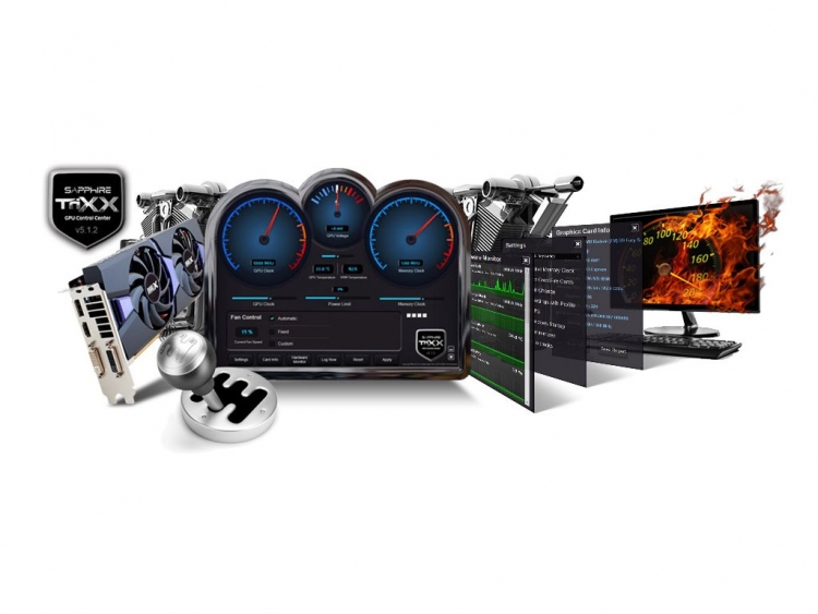 The new Sapphire TriXX 5.2.1 software comes with a new user interface which offers both voltage, frequency and temperature monitoring via neat looking analog dials as well as GPU voltage and frequency, HBM frequency overclocking and fan settings. According to Sapphire, the new TriXX 5.2.1 software also supports voltage control on other Radeon R9 300 series graphics cards.