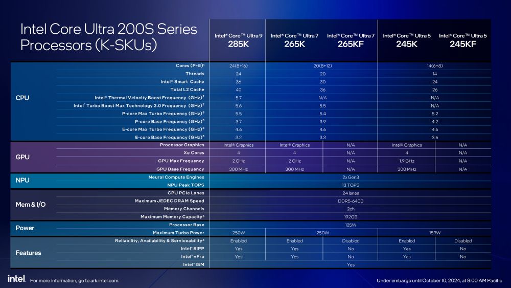 In case you missed the previous announcement, Intel has a total of five SKUs, ranging from the flagship 24-core Core Ultra 9 285K, down to the Core Ultra 5 245K(F). The KF-series SKUs will lack the GPU. The TDP of the flagship SKU is at 125W PL1 to 250W MTP. As said, the flagship 24-core Core Ultra 9 285K (8P+16E, 36 MB L3 cache) is priced at USD $590. It is followed by the Core Ultra 7 265K (8P+12E, 30 MB L3 cache), priced at $390, and the Core Ultra 5 245K (6P+8E, 24 MB L3 cache), priced at $310. Intel also has two SKUs without the iGPU, the 265KF and 245KF, which are priced at $15 lower compared to their counterparts with GPU. You can find them both over at Amazon.com or over at Newegg.com.
